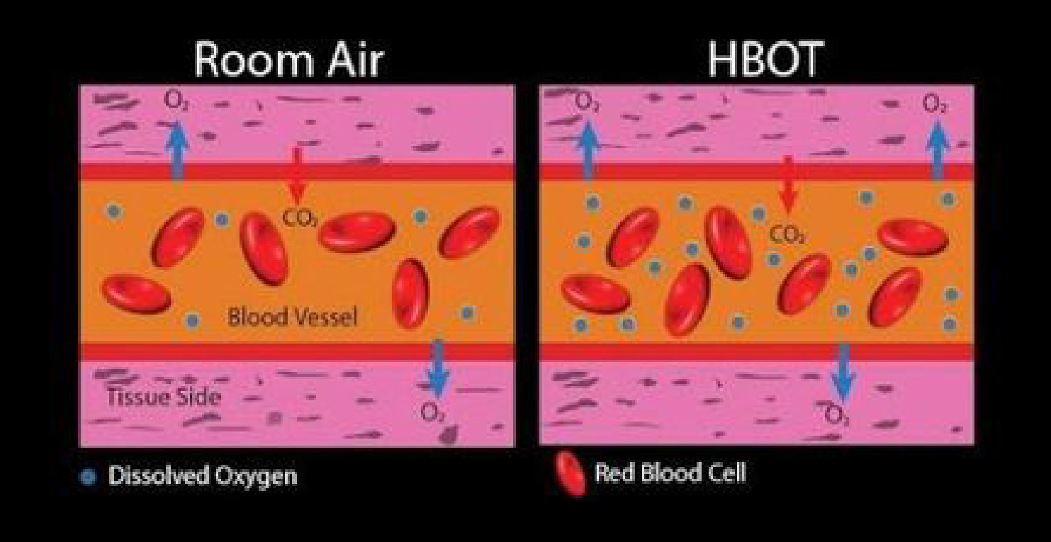 Under normal circumstances, oxygen is transported throughout the body by red blood cells. With HBOT, oxygen dissolves into all of the body’s fluids, the plasma, the central nervous system fluids, the lymph, and the bone. During the dissolve, oxygen can be carried to areas of diminished or blocked circulation, helping the body support its own healing process. This process greatly enhances the body’s ability of white blood cells to kill bacteria, reduce swelling, and allow new blood vessels to grow more rapidly in affected areas. HBOT is simple and painless.